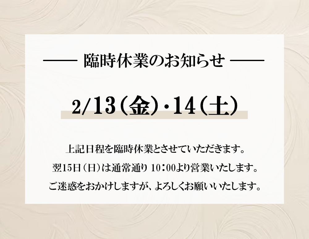 2月13日(金)・14日(土)は臨時休業とさせていただきます。 翌15日(日)は通常通り 10:00より営業いたします。 ご迷惑をおかけしますが、よろしくお願いいたします。